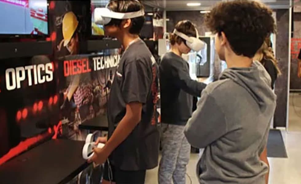 A 78-foot double expandable Be Pro Be Proud trailer features twelve interactive stations involving virtual and augmented reality that put students in the role of the prospective occupations. Camden Fairview students “drove” big rigs, “fixed” power lines and assumed the role of a train engineer.