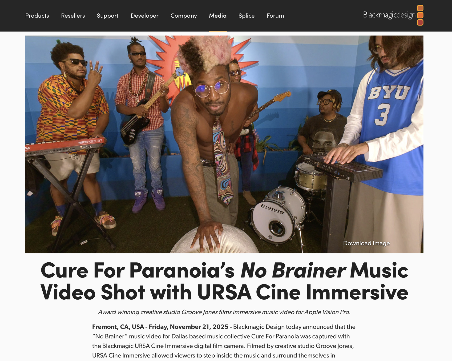 Fremont, CA, USA – Friday, November 21, 2025 – Blackmagic Design today announced that the “No Brainer” music video for Dallas based music collective Cure For Paranoia was captured with the Blackmagic URSA Cine Immersive digital film camera. Filmed by creative studio Groove Jones, URSA Cine Immersive allowed viewers to step inside the music and surround themselves in a cinematic, stereoscopic media performance environment. The immersive music video is available to view on Apple Vision Pro using Spatial Browsing mode in Safari, available with visionOS 26 or later.