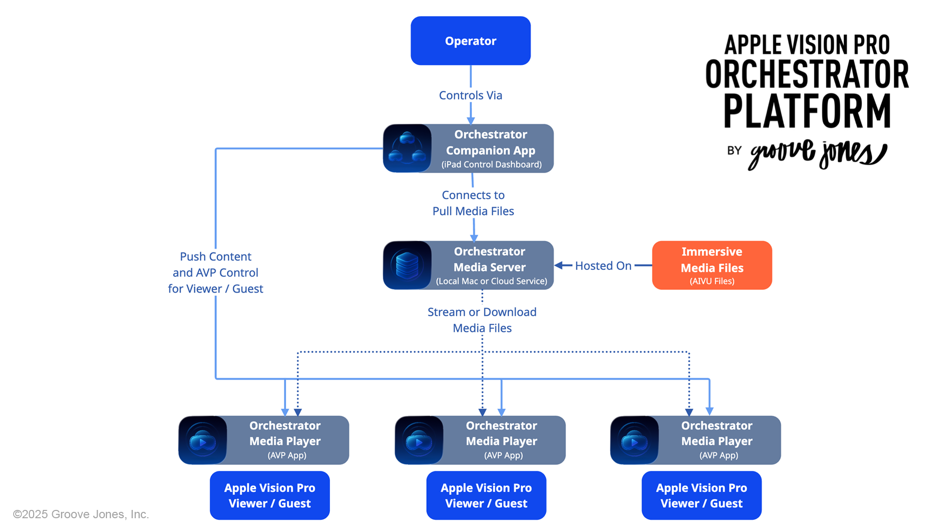The Orchestrator Ecosystem continues this legacy of leadership. By combining powerful orchestration tools, robust media hosting, and high-quality playback, we provide clients with a turnkey solution for deploying Apple Vision Pro at scale. Whether for live events, brand activations, or enterprise environments, Groove Jones ensures that every immersive experience is delivered with the polish, precision, and creativity that have defined our work from the very beginning.