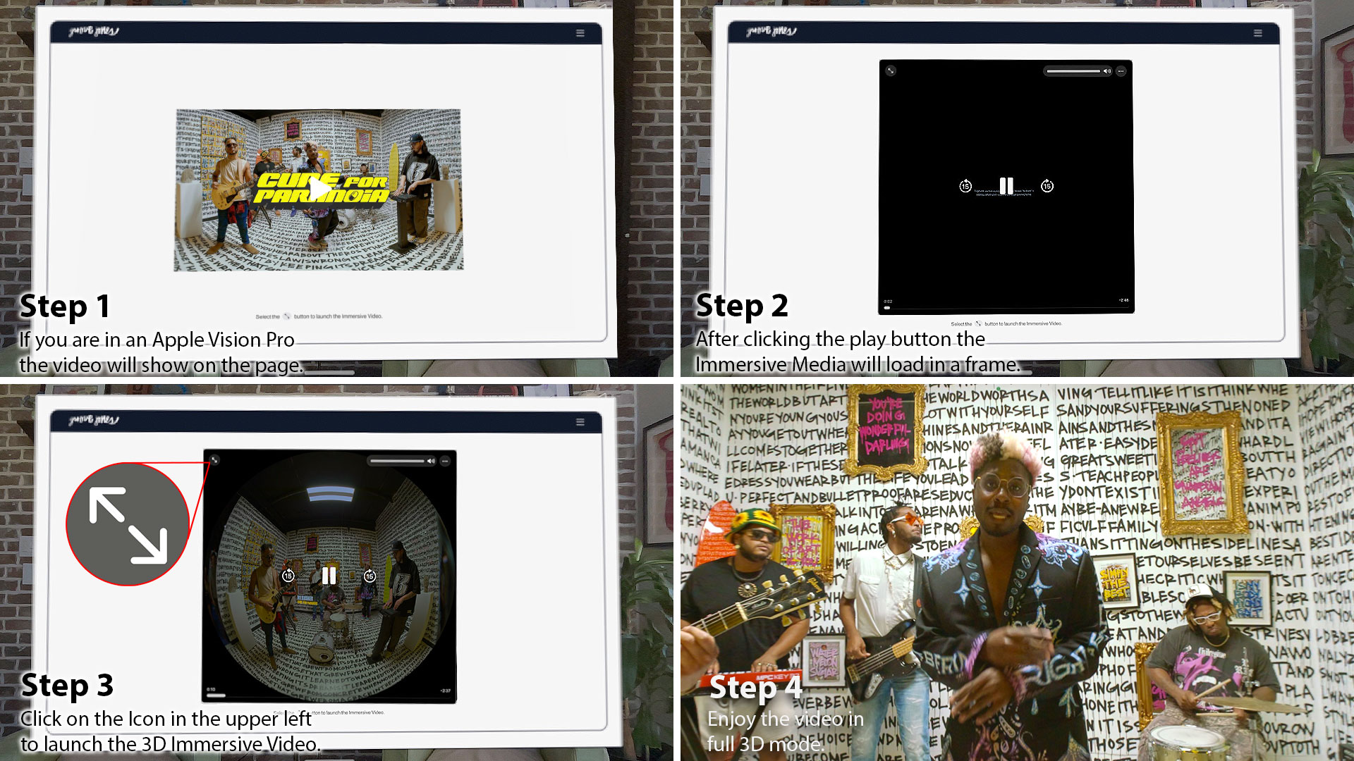 Since the best way to watch the video is on the Apple Vision Pro, device owners can now view it as it was intended to be as a full immersive experience. Groove Jones integrated the experience into a specially built Safari web page using new technology introduced by Apple that they call Spatial Browsing. Spatial Browsing is a feature in the Safari app on the Apple Vision Pro that transforms standard web pages into an immersive “spatial experiences.” When you enable this feature, it dynamically rearranges web content in your physical space and enhances the visual elements around you.