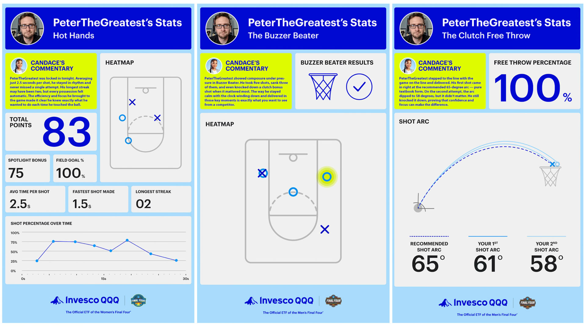 At the Invesco QQQ Final Four experience, Groove Jones took fan engagement to a new level by using AI to create personalized performance scorecards. In the game, we used computer vision to analyze a player’s performance and translated that data into a custom performance profile. By examining the ball’s flight path, our computer vision system calculated shooting arcs for every attempt. We also track the makes and misses, which were mapped onto a court graphic on the screen to generate a heat map of performance. The scorecard was then emailed to guest with their performance data can customized commentary by Candace Parker.