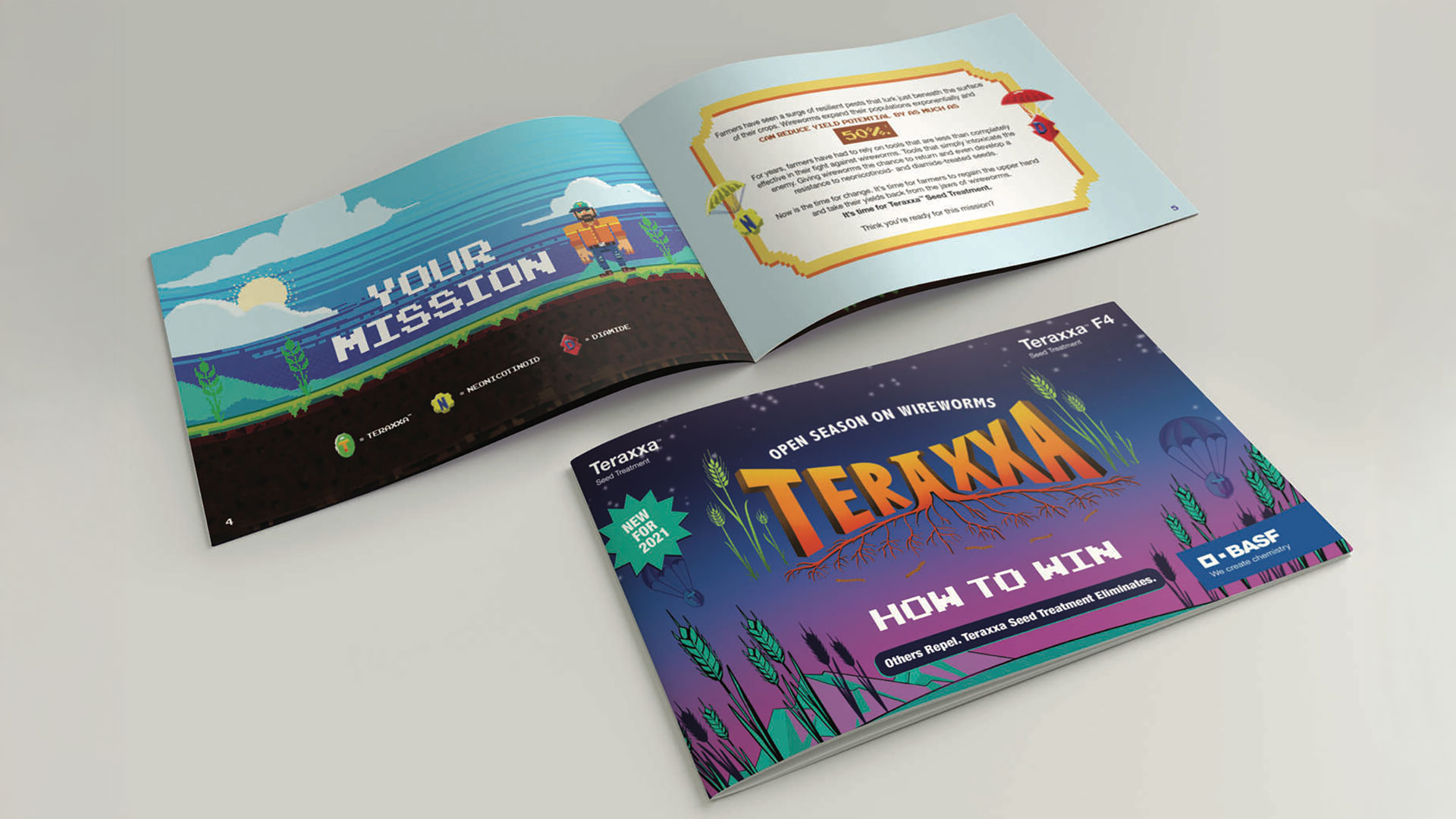 VMLY&R created a stylized booklet with details about the Teraxxa™ Seed Treatment as the trouble with wireworms. Each page is illustrated with 8-bit graphics from the game and the higher fidelity arcade cabinet artwork.